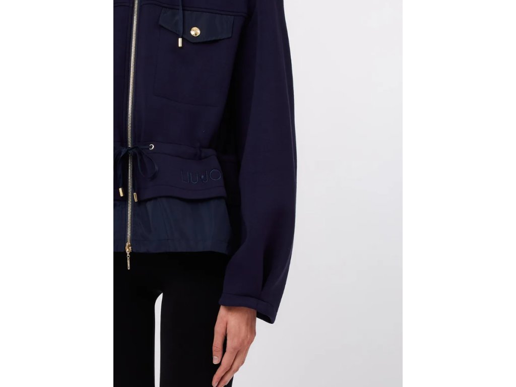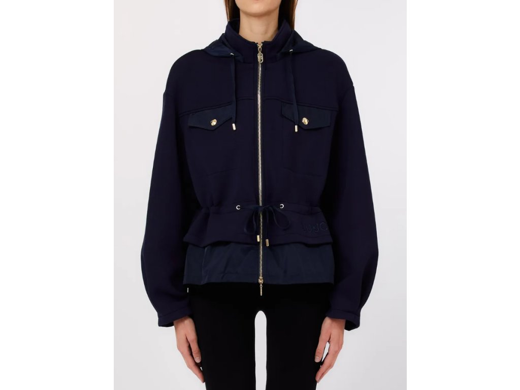 Bunda vyrobená ze dvou materiálu s předními kapsami a šňůrkou v pase.