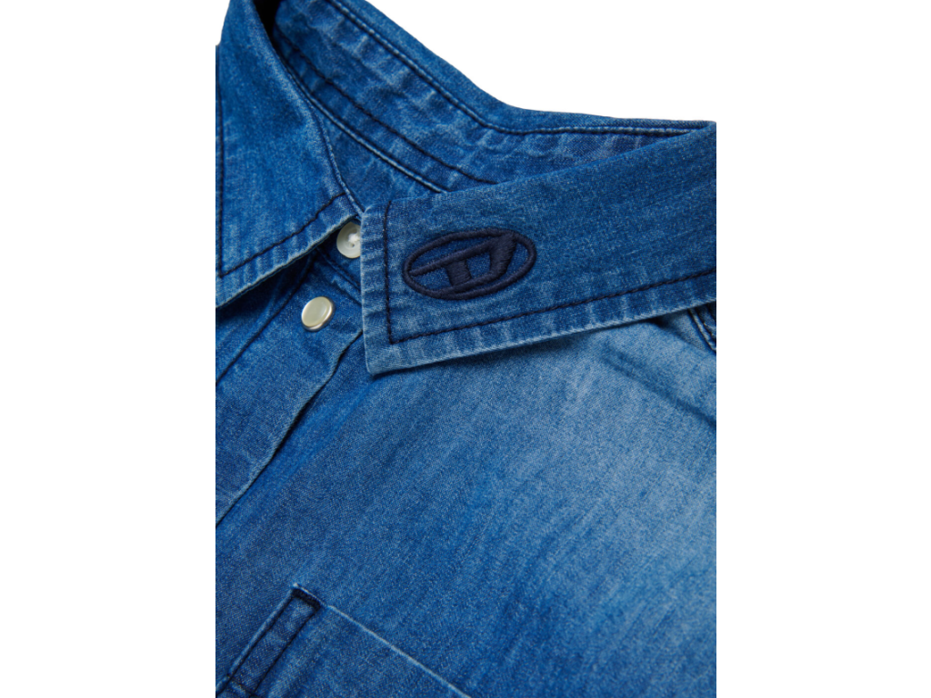 Džínová košile s krátkým rukávem a kapsou na hrudi. Vyrobena z bavlněného denimu, design je doplněn zapínáním na druky vpředu a má lehce vybledlý styl pro obnošený vzhled. Na límci je vyšívané logo Oval D