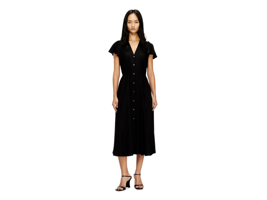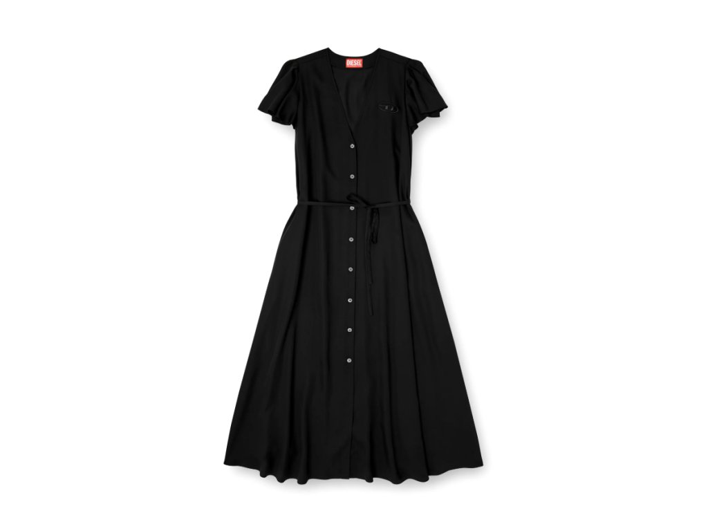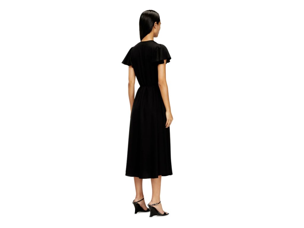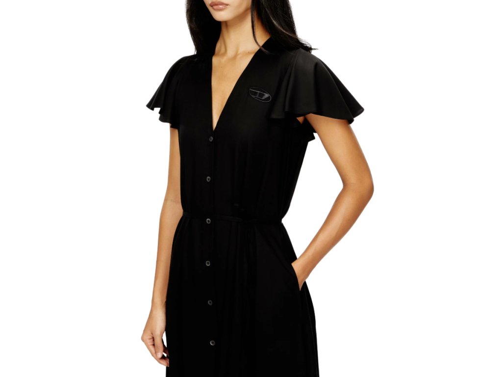 Splývavé dámské midi šaty jsou doplněny o volánkové rukávky a vyšité logo D na levé straně hrudi.
