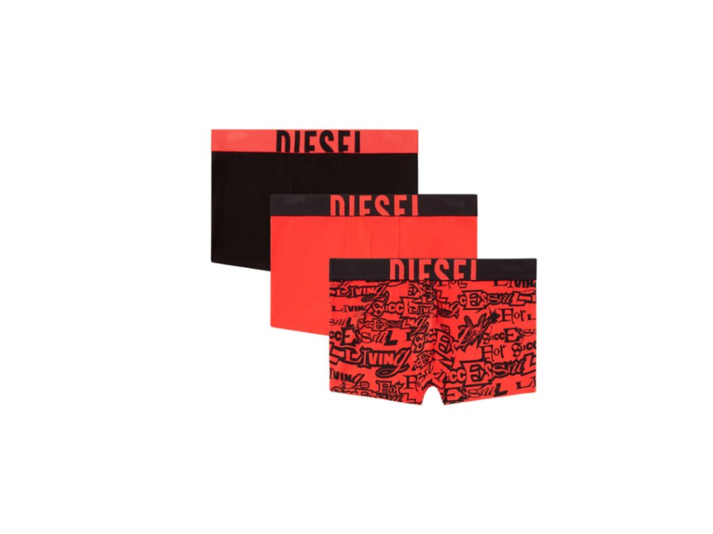 Sada tří pánských boxerek z pružné bavlny pro maximální flexibilitu. S širokým 4cm elastickým pasem s výrazným logem Diesel a celoplošným nápisem „For Successful Living“ na jednom páru. Další dva páry jsou jednobarevné.