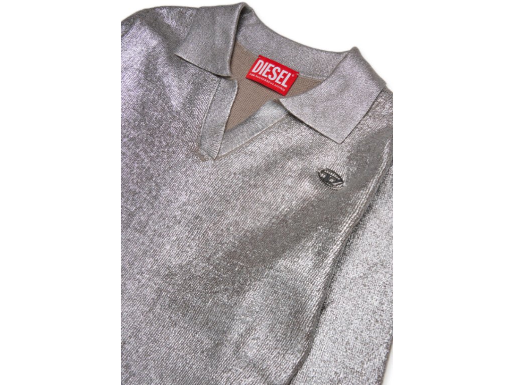 Dámské midi šaty z vlněné směsi s polo límečkem a dlouhým rukávem. Vynikají luminiscenčním efektem díky lesklé struktuře. Šaty jsou doplněny výrazným logem Oval D na hrudi.