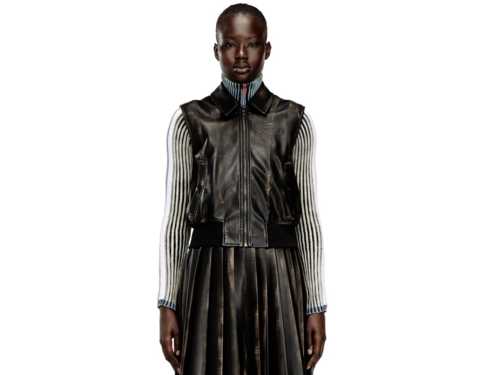 Dámská bomber vesta. Tento model klasický rovný střih a je vyroben z měkké umělé kůže a ručně kartáčován, aby vytvořil přirozeně opotřebovaný, vybledlý vzhled. Siluetu lemuje límec a žebrované lemy, které jsou doplněny logem Oval D na hrudi.