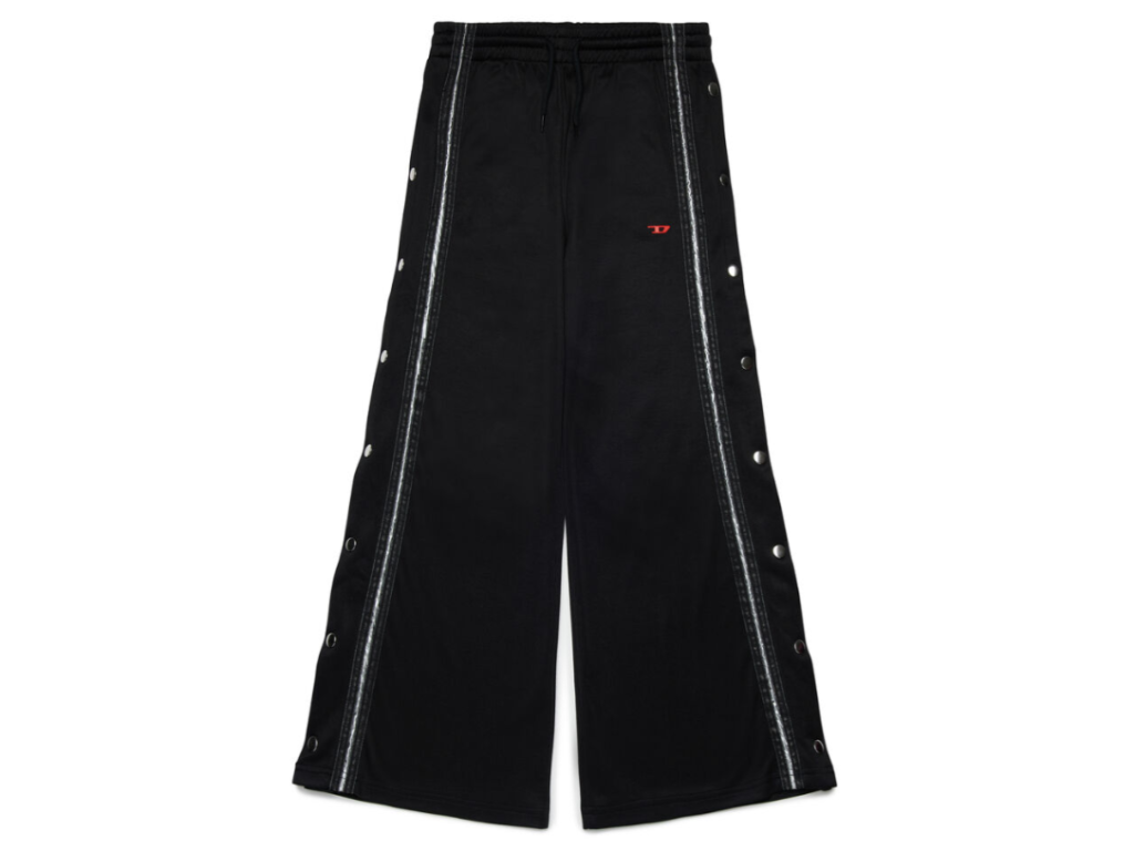 Tepláky z měkké technické směsi bavlny, s širokými nohavicemi a zapínáním na druky podél bočních švů. Elastický pas se stahovací šňůrkou a kontrastními pruhy, doplněný malým logem D na přední straně pro výrazný akcent.