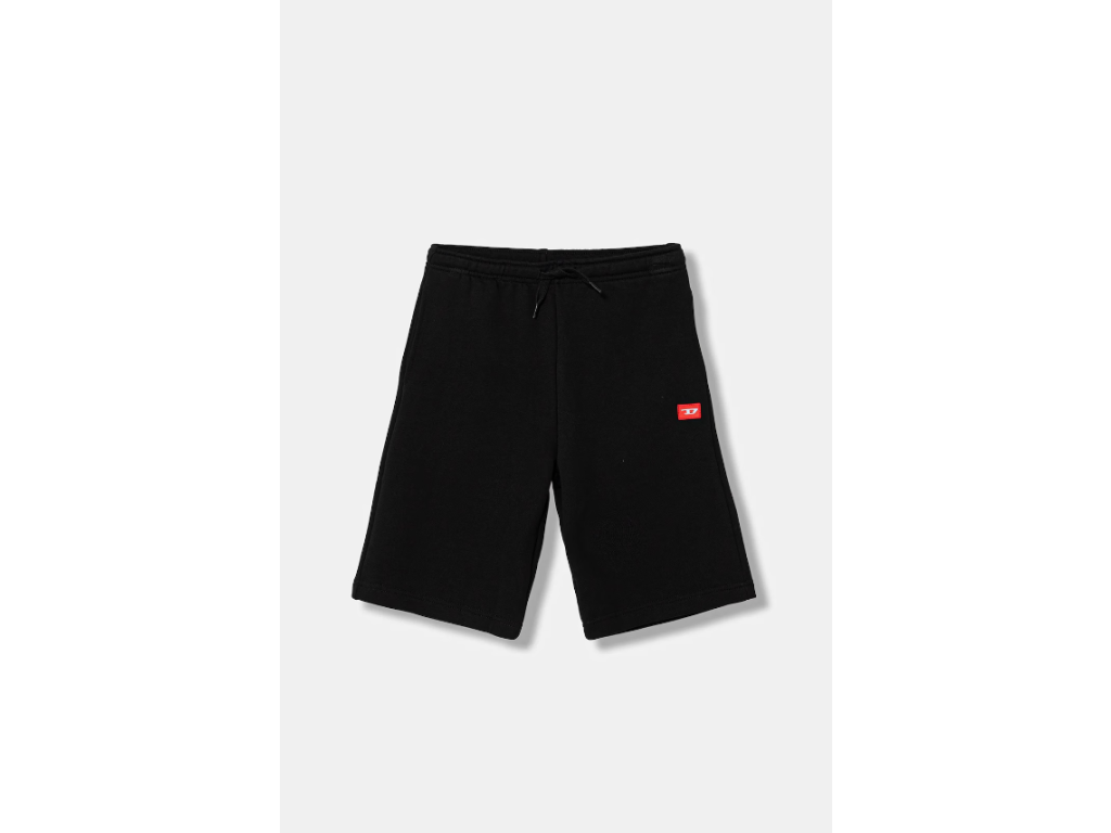 Kraťasy z bavlněného materiálu mají elastický pas se stahovací šňůrkou, boční kapsy a našívanou kapsu na zadní straně. Klasickou siluetu tepláků doplňuje kontrastní nášivka ve tvaru D na přední straně v ikonické červené barvě Diesel.