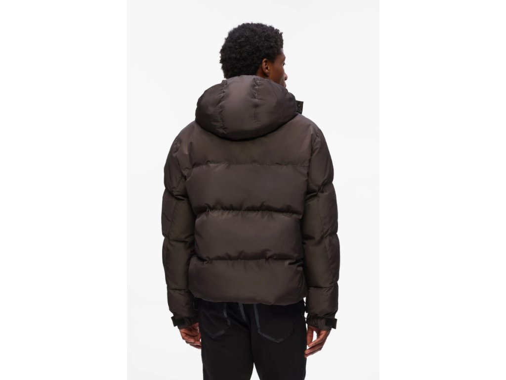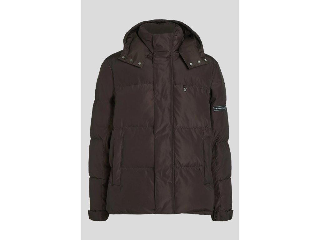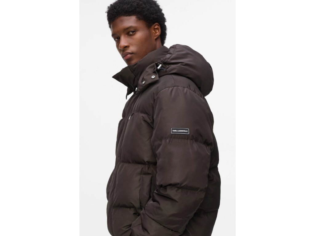Pánská zimní bunda rovného střihu s odepínací kapucí. Zapínání na dvoucestný zip do stojáčku, pružné a příjemně měkké náplety na rukávech, branding na hrudi, dvě boční kapsy a texturované panely s monogramem Karla na vnitřních rukávech a uvnitř kapuce pro větší odolnost. Stahovací šňůrky se značkovými zarážkami na kapuci a spodním lemu. Materiálové složení vrchní části tvoří pevná tkanina z kvalitního syntetického vlákna, která díky prvotřídnímu zpracování odolá lehkému dešti a neprofoukne. Výplň z dutého vlákna zaručuje lehkost, příjemné teplo a nenáročnou údržbu.