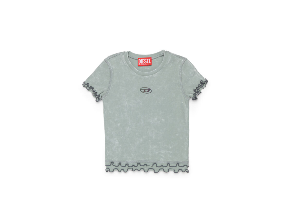 Tričko má kulatý výstřih a krátké rukávy a je vyrobeno z jemně žebrované strečové bavlněné směsi pro měkký a pružný střih. Tričko vyniká svým kyselinově sepraným efektem a zdobí ho vlnité lemy na rukávech a dolním lemu. Na hrudi je vyšité logo Oval D, které mu dodává stylový vzhled.