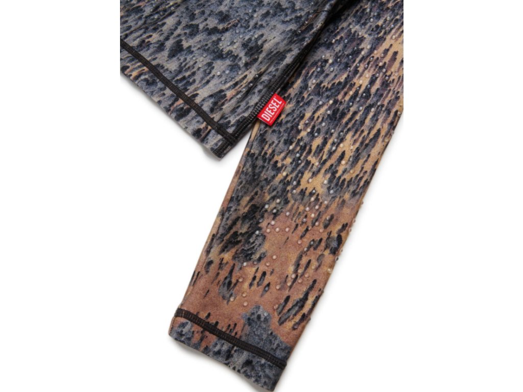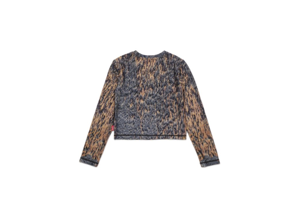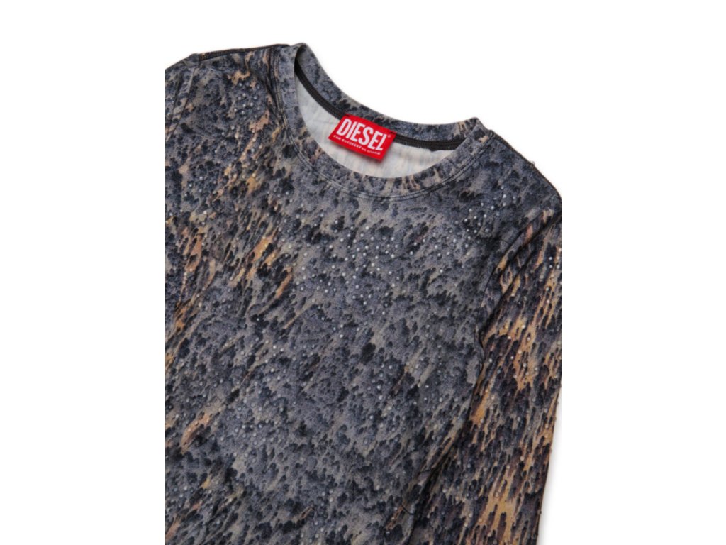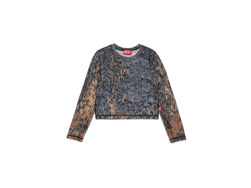 Dámský zkráceny top s dlouhým rukávem a kulatým výstřihem je zdoben celoplošným grafickým potiskem s krystalky ve tvaru kapky. Top je doplněn logo DIESEL na bočním švu.