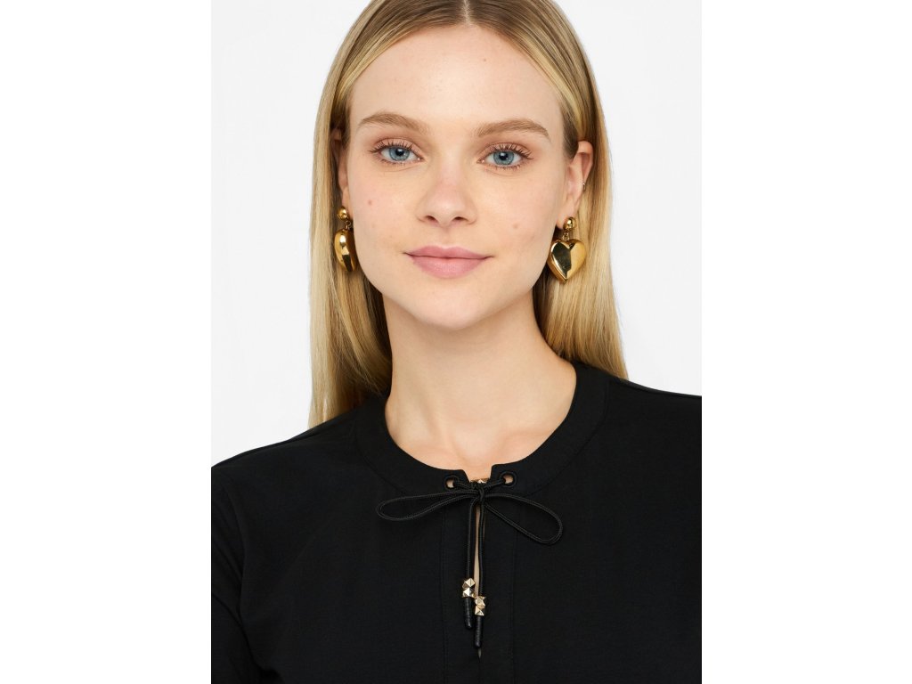 - Kulatý výstřih s motivem ve tvaru V a detailem vázání
